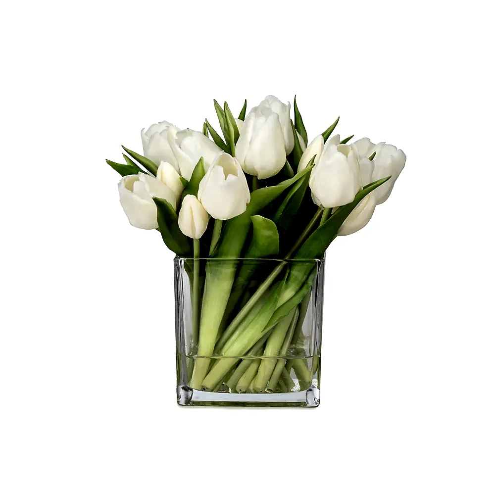 Orta Boy Kare Cam Vazoda Islak Dokulu Jelli Beyaz Lale Aranjman (25 CM)