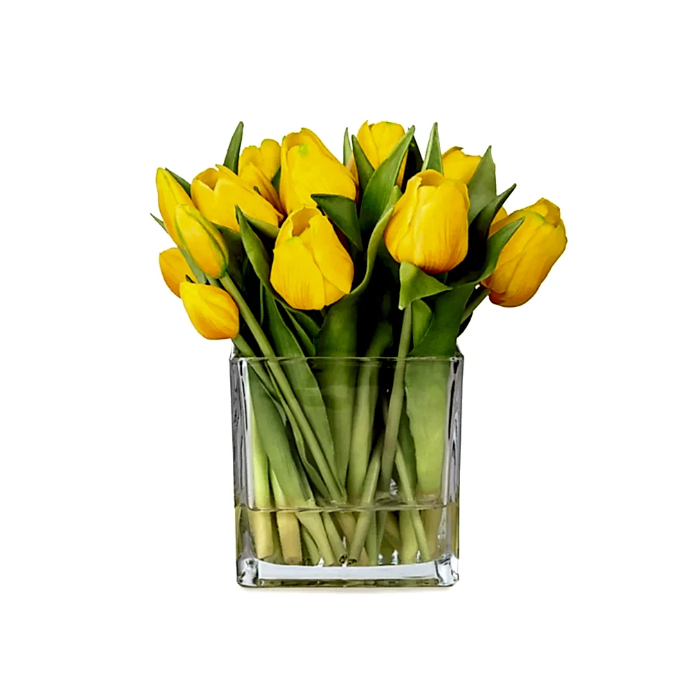 Orta Boy Kare Cam Vazoda Islak Dokulu Jelli Sarı Lale Aranjman (25 CM)